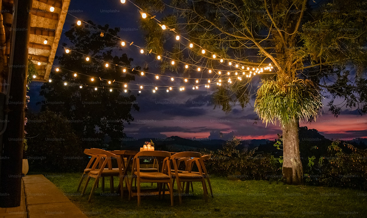 - 氣氛照明:串燈、星星燈與吊燈可穿插於帳棚與樹木之間,搭配暖白或黃光,創造溫暖、夢幻的視覺效果。